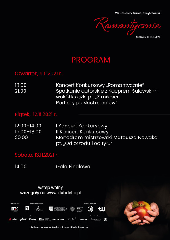 Klub Delta przy ul. Racławickiej 10 w czwartek, 11 listopada, zaprasza na Jesienny Turniej Recytatorski „Romantycznie”. Wydarzenie już po raz dwudziesty szósty przyciągnie najlepszych recytatorów, którzy sztuką żywego słowa świętować będą rocznicę odzyskania przez Polskę niepodległości. Tegoroczna edycja turnieju rozpocznie się się 11 listopada o godz. 18:00. Gala finałowa odbędzie się w sobotę, 13 listopada, o godz. 14:00. Wydarzenia będą również transmitowane na Facebooku Klubu Delta. Wstęp wolny. W ramach wydarzeń towarzyszących odbędzie się także spotkanie autorskie z Kacprem Sulowskim wokół jego literackiego debiutu „Z miłości. Portrety polskich domów” (11 listopada, godz. 21:00) oraz mistrzowski wieczór z monodramem „Od przodu i od tyłu” (12 listopada, godz. 20:00). Szczegółowy program tutaj