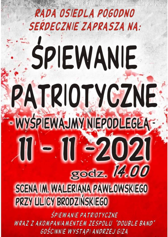 Rada Osiedla Pogodno 11 listopada zaprasza na wspólne śpiewanie pieśni patriotycznych. Start o godz. 14:00 na skwerze im. W. Pawłowskiego przy ulicy Brodzińskiego. Wstęp wolny.