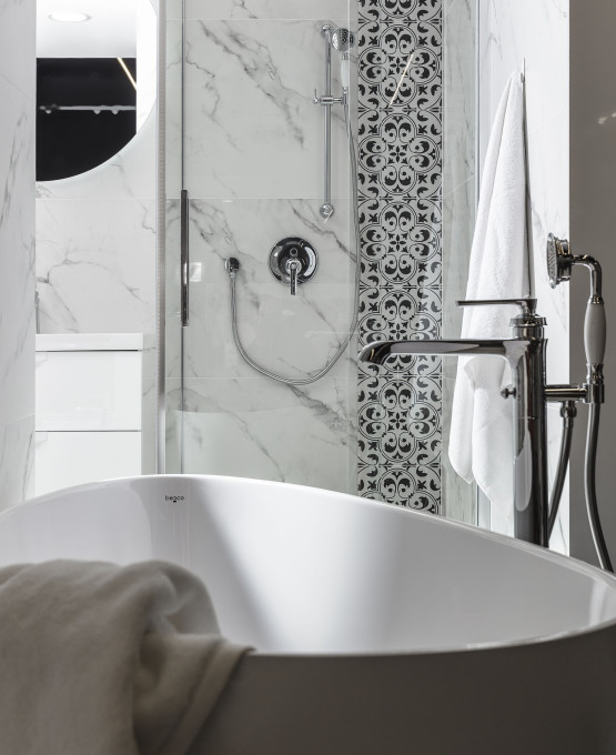 - Strefę kąpielową – zalicza się do niej przede wszystkim wanna lub prysznic. Projektując tę część łazienki, należy uwzględnić także przestrzeń umożliwiającą wygodne korzystanie z ww. akcesoriów. Wstępne pomiary wskazują na to, że w Twojej łazience zmieści się stylowa wanna wolnostojąca? Upewnij się, czy wokół niej będzie dostateczna ilość miejsca, by możliwe było wygodne wchodzenie i wychodzenie oraz przemieszczanie się między sprzętami.