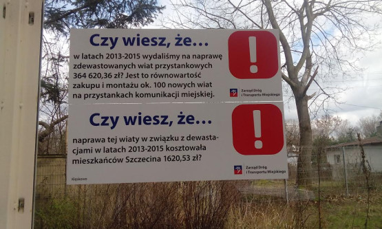 „Czy wiesz, że w latach 2013-2015 wydaliśmy 364 620,36 zł na naprawę zdewastowanych wiat przystankowych? Jest to równowartość zakupu i montażu ok. 100 nowych wiat.” Takie informacje pasażerowie będą mogli zobaczyć w 300 miejscach w naszym mieście. Mają odstraszyć przystankowych wandali.