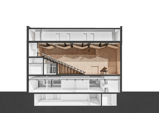 Prezentowana wcześniej koncepcja zakłada, że najważniejszą częścią Centrum będzie sala widowiskowa. Największa w zasobach Akademii Sztuki, bo mogąca pomieścić ponad 100 osób. Obok niej zaplanowano galerię o powierzchni 300 m2, kawiarnię, pokoje gościnne oraz pomieszczenia magazynowe i techniczne.