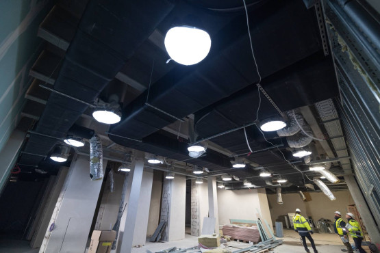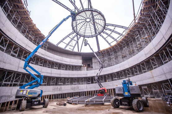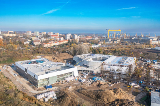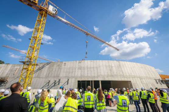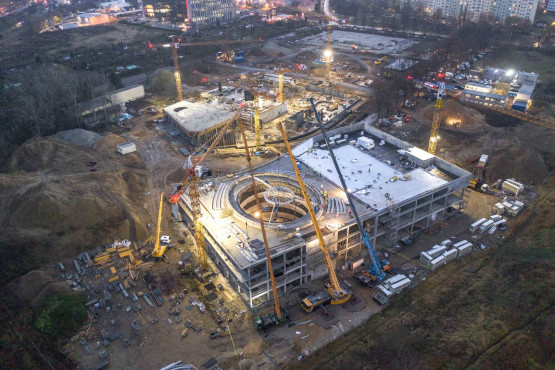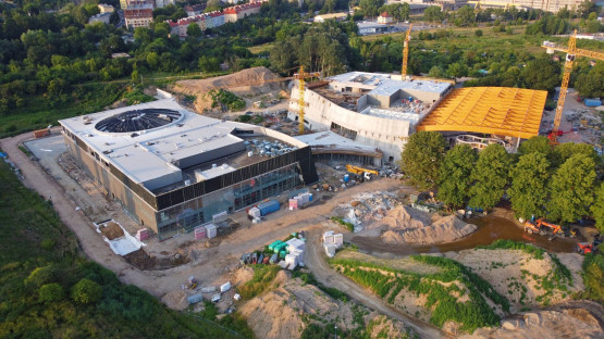 Szybciej powstawał budynek Edukatorium i to właśnie w nim, pod koniec 2020 roku, rozpoczął się montaż 115 tonowej konstrukcji stalowego świetlika i ogromnego modelu cząsteczki wody.