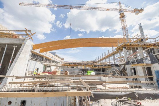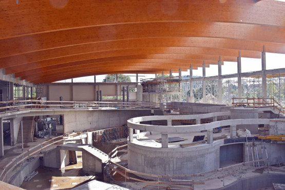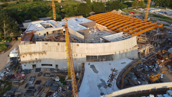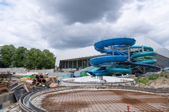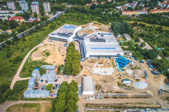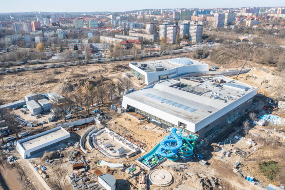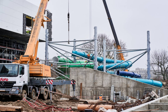 W sierpniu 2021 roku na obiekcie zawisła wiecha. Kolejne tygodnie, to oprócz prac konstrukcyjnych, także prace wykończeniowe i instalacyjne. Wówczas pojawiły się pierwsze fragmenty elewacji, zainstalowana została szklana fasada. Kontynuowany był montaż kolejnych niecek basenowych.