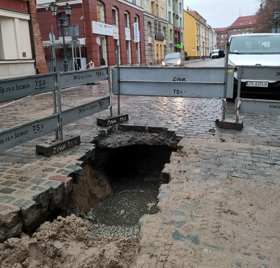 Wielka wyrwa w jezdni w centrum Szczecina. To z powodu awarii sieci wodociągowej