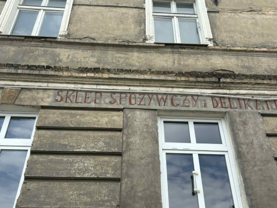 Spod czerwonego napisu – „Sklep spożywczy i delikatesy”, wyłaniają się czarne litery – „Feinbäckerei Wilhelm Blankenburg”. To napi...