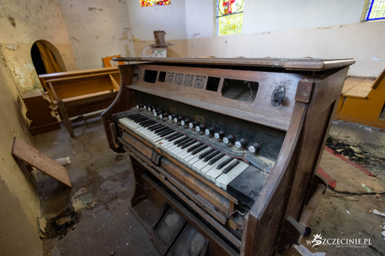 Szeroko otwarte drzwi, brud, śmieci, zniszczone elementy wyposażenia, a wśród nich robiąca największe wrażenie stara fisharmonia –...