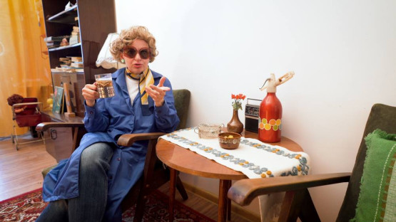 W łazience stoi oczywiście słynna pralka Frania, w dużym pokoju można usiąść przy kawie w charakterystycznym koszyczku przed telew...