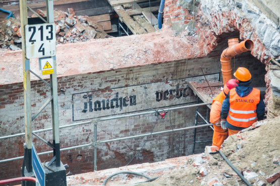 W wykopie tuż przy nowej kładce na peronie drugim wyraźnie widać ceglaną konstrukcję tunelu i napis na ścianie: „rauchen verboten”...