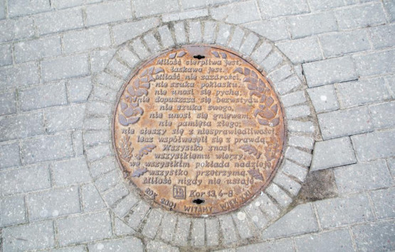 Hymn o miłości, czyli fragmenty listu św. Pawła do Koryntian, można odczytać z pokrywy studzienki kanalizacyjnej przy ul. Staromły...