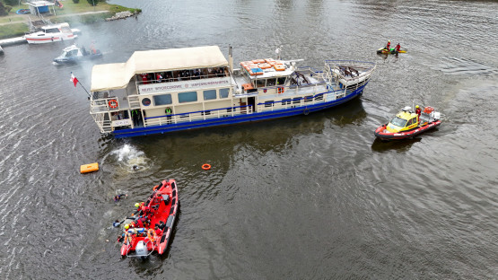 Ćwiczenia ratunkowe na Odrze. Sprawdzano scenariusz z płonącym statkiem i pasażerami skaczącymi do wody [foto]