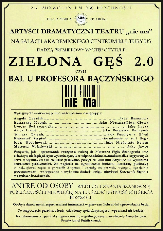 Po blisko trzech latach od premiery spektaklu ”Zielona Gęś” Teatr Nie Ma prezentuje szczecińskiej publiczności jego kontynuację oz...