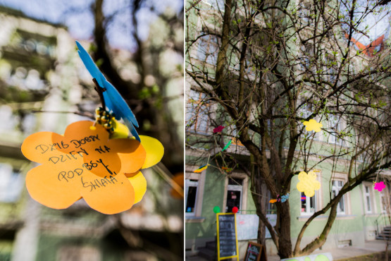 Kilkadziesiąt motyli i kwiatków ozdobiło drzewo rosnące przed Zakręconą Kawiarenką przy al. Jana Pawła II. Na kolorowych karteczka...