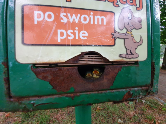 Pisklęta wykluły się w pojemniku z woreczkami na psie odchody. „Wyglądają jak karmniki i ptaki się mylą”