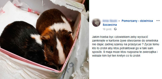 Świnki morskie wyrzucone na śmietnik w kartonie po butach. Skandaliczna sytuacja na Pomorzanach