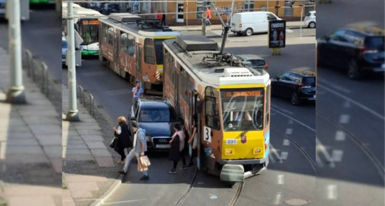 Luksusowe auto "przytuliło się" do trójki. Potężne korki na Niebuszewie