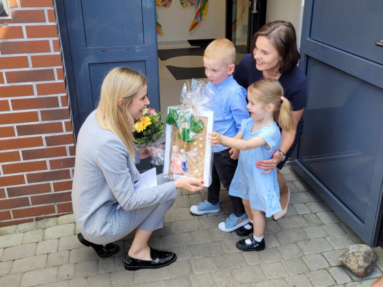 Ministra Aleksandra Gajewska w Szczecinie została przywitana przez dwójkę maluchów, którzy wręczyli jej kwiaty i pamiątkowy obraze...