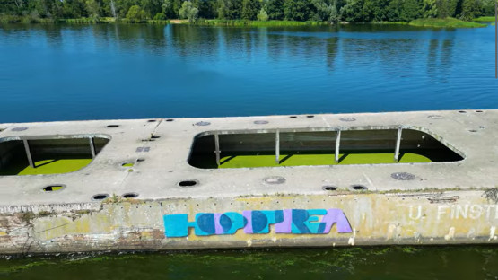Pomimo że wcale nie jest tak łatwo się do niego dostać, to i tak padł łupem wandali. Burta betonowca z czasów II wojny światowej z...