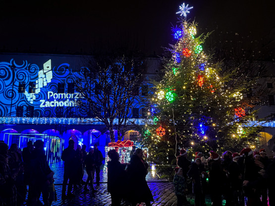 Przed mikołajkami, na dużym dziedzińcu Zamku Książąt Pomorskich, prawie dziesięciometrowe drzewko rozświetliło się tysiącem koloro...