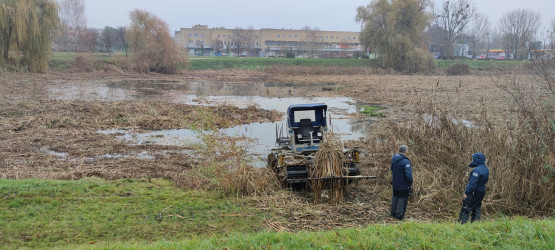 Pływająca maszyna wycina trzcinę na Jeziorze Słonecznym. W planach jest także odmulanie dna