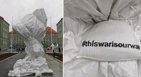 Rzeźba Gryfa Pomorskiego zniknęła pod białą płachtą. To wyraz solidarności szczecińskich artystów