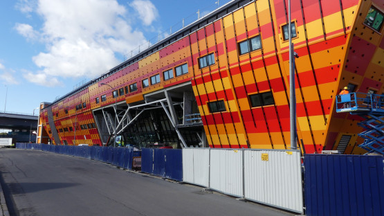 Na budowie Morskiego Centrum Nauki rozpoczęto montaż szklanej fasady na południowej części budynku. Ekipy montażowe korzystają ze...