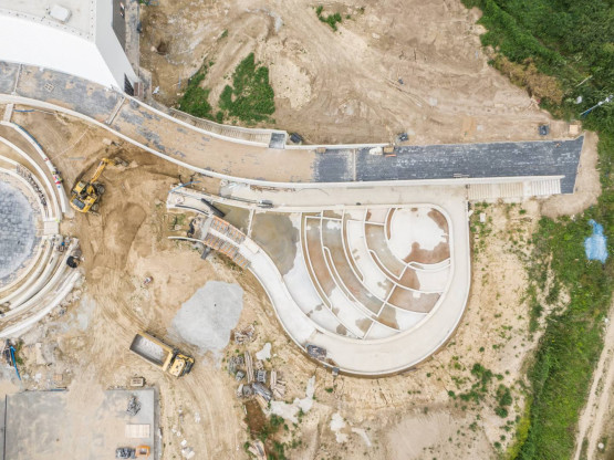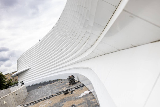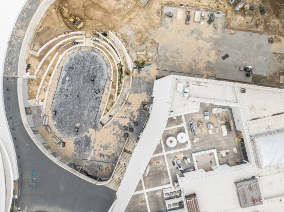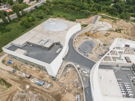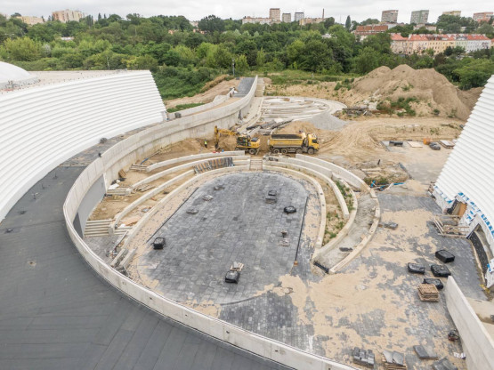 Atrakcje przewidziano też w zewnętrznej części obiektu. Obecnie trwa tam m.in. zbrojenie zachodniego murku toru lodowego, wykonywane są podbudowy pod fundamenty raftingu, prowadzone są prace brukarskie na placu amfiteatru i kładce północnej.