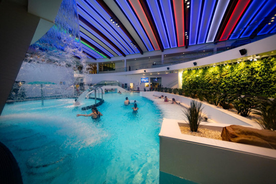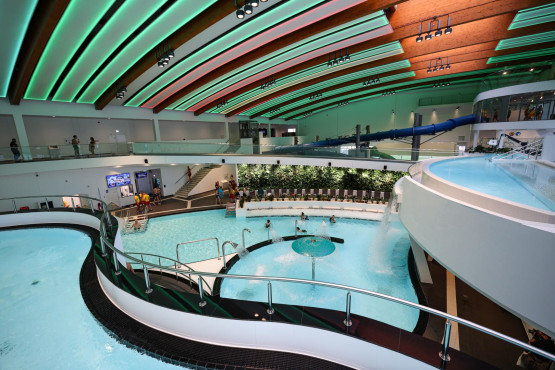 Sercem zadaszonej części jest główna sala basenowa z dużym basenem rekreacyjnym. Został on podzielony na trzy części, z wodnymi leżankami, wodospadem i siatkami do wspinaczki.