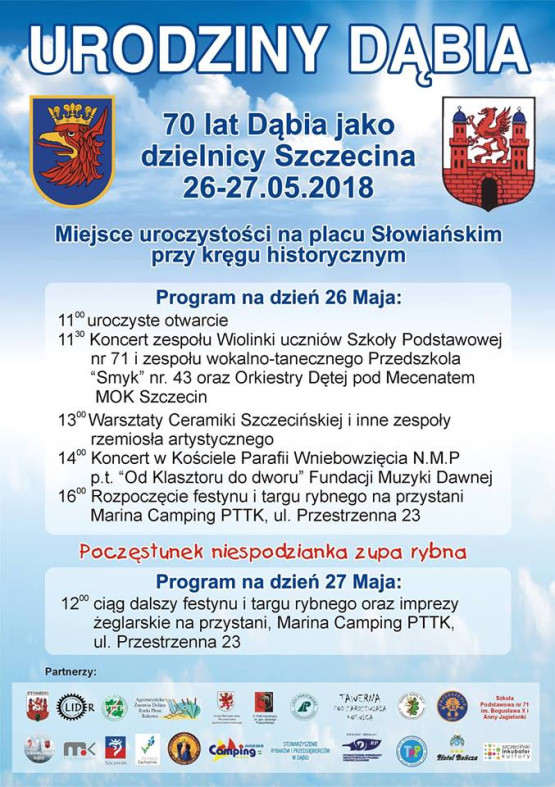 W sobotę i niedzielę, 26 i 27 maja, mieszkańcy Dąbia świętować będą 70-lecie Dąbia jako dzielnicy Szczecina. W programie uroczystości, które w sobotę o 11:00 rozpoczną się na pl. Słowiańskim znalazły się koncerty zespołów tanecznych i wokalnych, a także warsztaty ceramiki szczecińskiej. O godz. 14:00 w kościele Parafii Wniebowzięcia NMP odbędzie się koncert „Od klasztoru do dworu”. Z kolei o godz. 16:00 na przystani przy ul. Przestrzennej 23 rozpocznie się festyn oraz tar rybny. Festyn będzie można odwiedzać także w niedzielę, 27 maja.