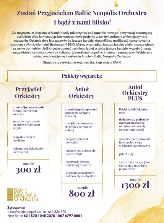 Jeżeli szukacie bardziej oryginalnych pomysłów na tegoroczne świąteczne podarki lub po prostu chcecie być świadomymi uczestnikami kultury, Baltic Neopolis Orchestra wystartowała ze sprzedażą specjalnych pakietów wsparcia: Przyjaciel Orkiestry, Anioł Orkiestry oraz Anioł Orkiestry PLUS, a każdy z nich pozwoli na poznanie orkiestry z innej, zakulisowej bądź nawet prywatnej strony. Cena waha się od 300 do 1300 zł za rok. W zależności, który z trzech pakietów wybierzemy, możemy wybrać się na próbę z wybranym artystą, mieć zarezerwowane miejsca w pierwszym rzędzie lub wziąć udział w specjalnym spotkaniu z muzykami po koncercie.
