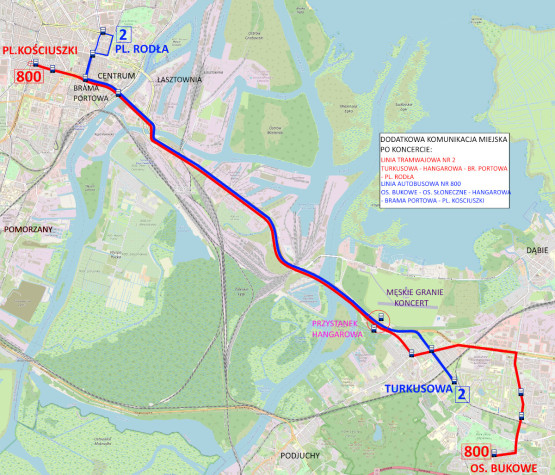 Uruchomiona zostanie także dodatkowa linia autobusowa nr 800 w relacji os. Bukowe – os. Słoneczne – Hangarowa – Brama Portowa – plac Kościuszki (przystanek 10422). W godz. 23:34 – 1:30 autobusy będą kursować z częstotliwością co 5 minut.