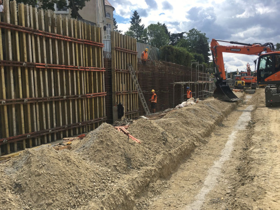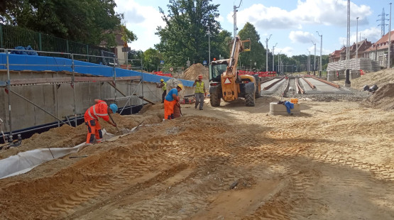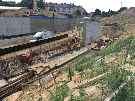 Prace rozpoczęły się w październiku 2018 r. Jednaka zamiast zaplanowanych 24 miesięcy, inwestycja potrwać ma 34 miesiące. Problem pojawił się w wykopie przygotowywanym pod tory kolejowe, w okolicy stacji benzynowej. Gromadziła się tam woda. Konieczne było zatrzymanie prac w tej części inwestycji i przygotowanie projektu dodatkowych prac odwadniających. Postawione zostaną tam ścianki szczelne, które zatrzymają napływ wód gruntowych. W związku z tym finał prac nie nastąpi pod koniec października 2020 r., tylko w sierpniu 2021 r.