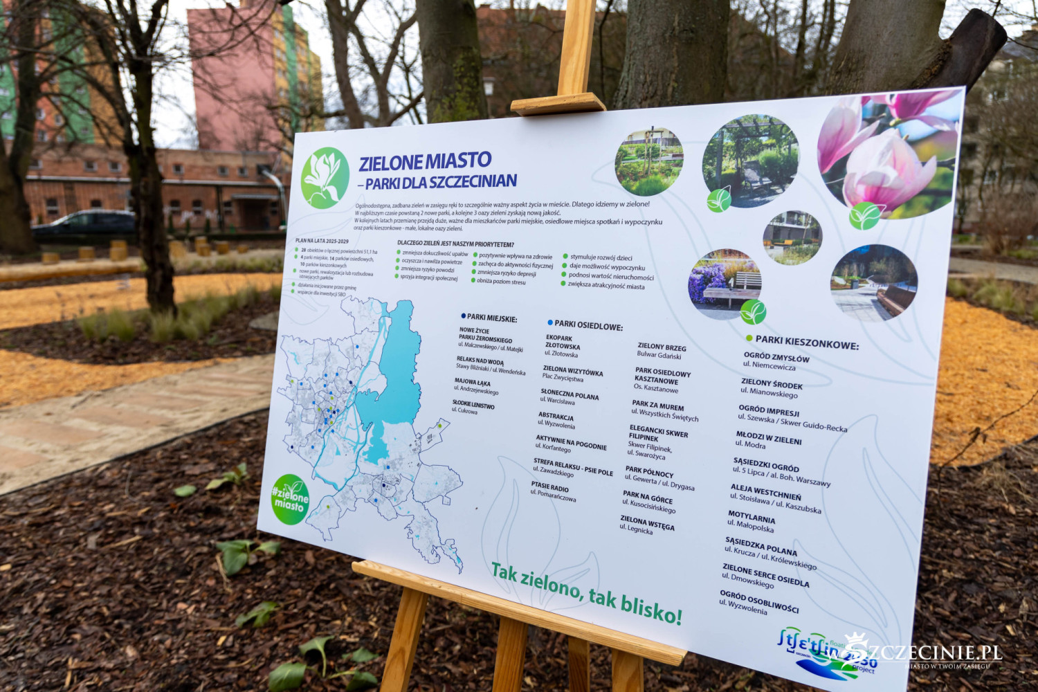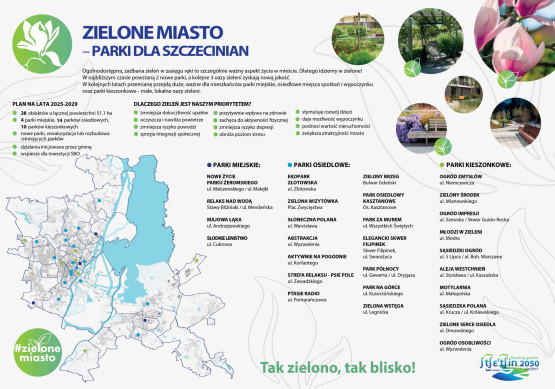 Miasto przedstawiło szczegółową mapę wszystkich parków. Są rozlokowane na terenie całego Szczecina, a dla każdego z nich zespół Ogrodnika Miasta stworzył oryginalną, wyjątkową koncepcję zagospodarowania, która ma korespondować, jak to określiła Marta Safader-Domańska, Ogrodniczka Miasta, z duchem i charakterem danego miejsca. Dzięki temu każdy park będzie inny.