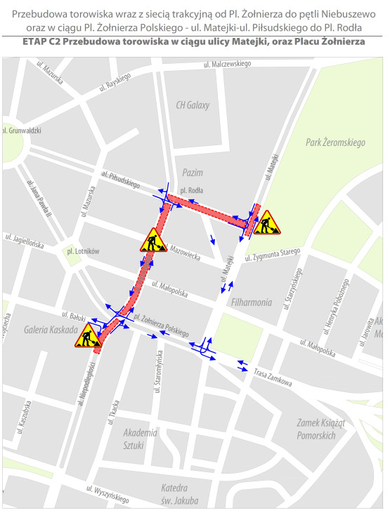 – W ramach tego etapu w dalszym ciagu wykonywane będą prace związane z przebudową układu drogowego i torowego na ulicy Matejki w rejonie skrzyżowania z ulicą Piłsudskiego, wzdłuż al. Niepodległości, al. Wyzwolenia od placu Żołnierza Polskiego do placu Rodła oraz ul. Piłsudskiego od placu Rodła do Matejki. W związku z tym wykonawca musi wprowadzić kolejne zmiany – informuje Hanna Pieczyńska, rzecznik prasowy miejskiej spółki Tramwaje Szczecińskie.