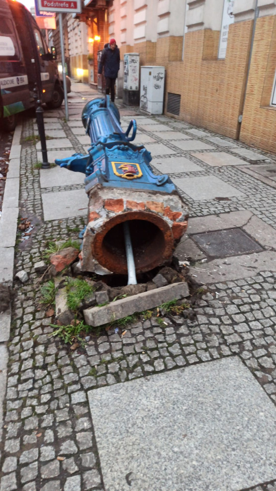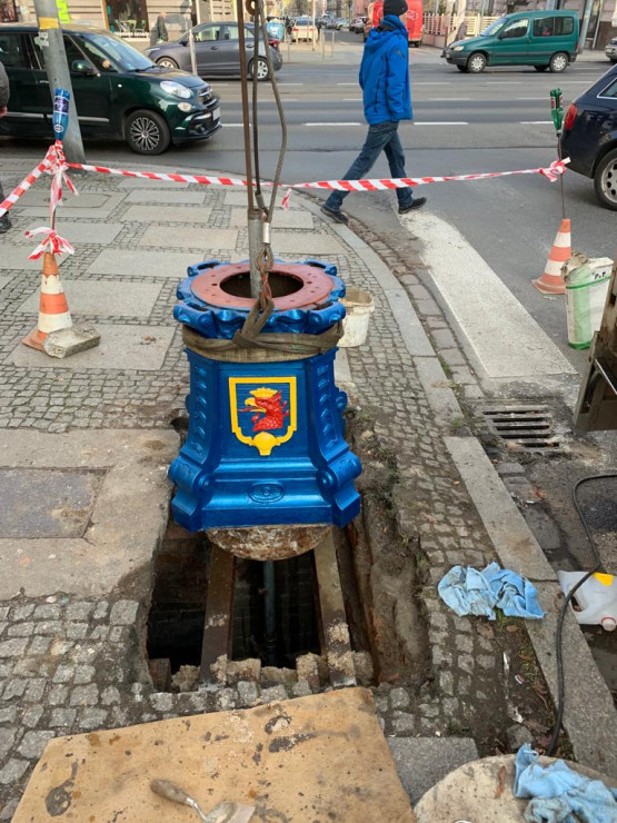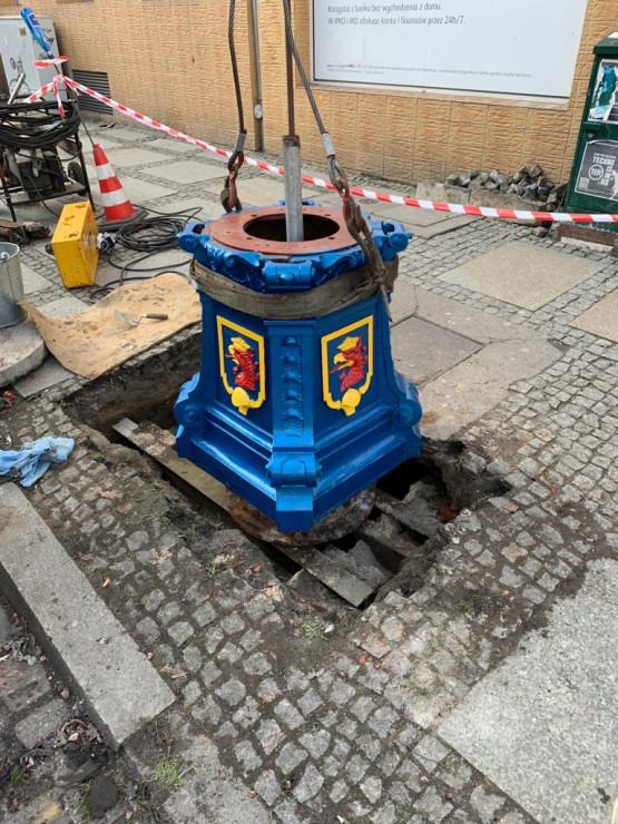 Mechanicy Zakładu Wodociągów i Kanalizacji ustawiają zabytkową pompę w pobliżu skrzyżowania ulic Krzywoustego i Błogosławionej Królowej Jadwigi. Przypomnijmy, że na początku tego roku nieznany sprawca uszkodził zabytek i uciekł z miejsca zdarzenia.