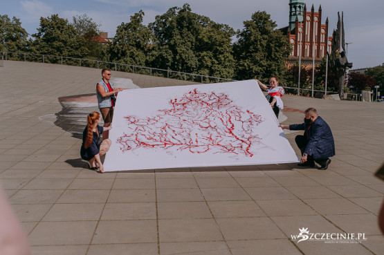 Ewa włożyła odświętną białą bluzkę i na plac Solidarności przyniosła pakunek zawinięty w biały papier. Koledzy pomagają jej go rozwinąć w płótno na trzy metry długości. Potem w kawiarni powiem jej, że ta praca jest jak całun Białorusi, na którym odbiły się rzeki państwa, które spłynęło krwią. - Folklor Białorusi jest powiązany z naturą - tłumaczy. - Rzeki są jak żyły w organizmie człowieka. Żyją rzeki, żyje Białoruś. Nawiązałam do cierpienia Białorusinów, stąd ta krew. Czerwony kolor to prawdziwy kolor naszej flagi.