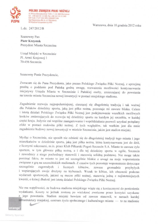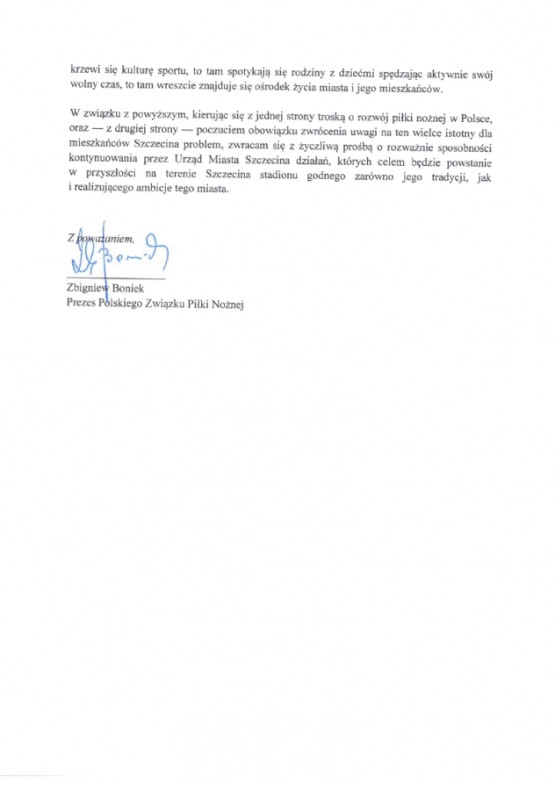 W swym liście prezes Polskiego Związku Piłki Nożnej odnosi się zarówno do swojej obecnej funkcji. Mówi o tym, iż celem PZPN-u jest podejmowanie wszelkich możliwych kroków zmierzających do rozwoju tej dziedziny sportu na każdym jej szczeblu, w każdej części kraju. Jedyne zaś wspólne zaangażowanie i współdziałanie pozwoli uzyskać pożądany efekt w postaci rozkwitu piłki nożnej. Z tych względów, tak ważkim jest dla mnie zagadnienie budowy nowej inwestycji w mieście Szczecinie, jakim jest stadion miejski.