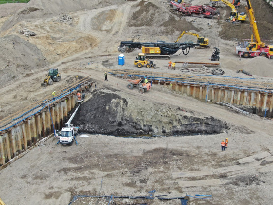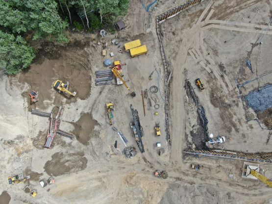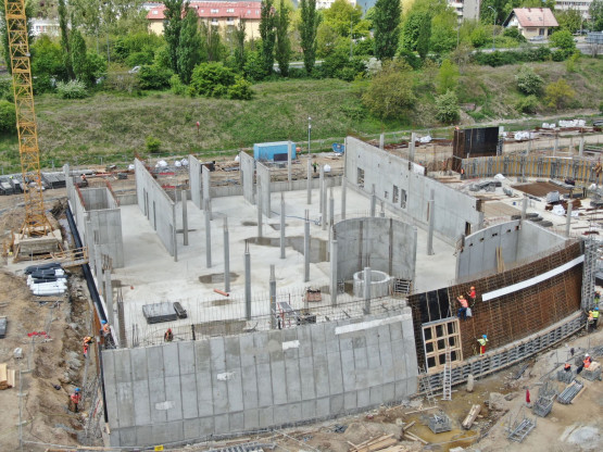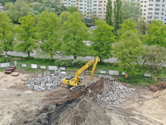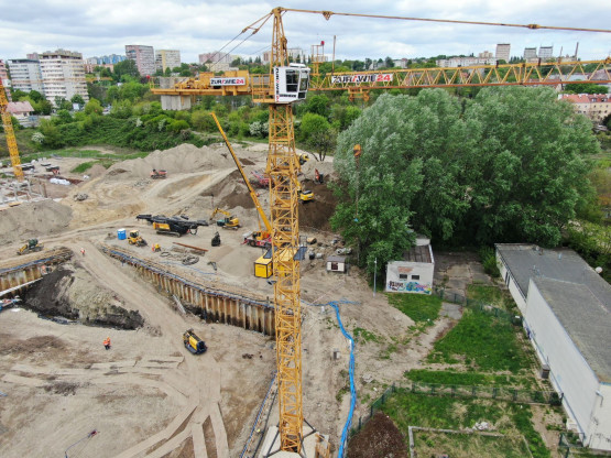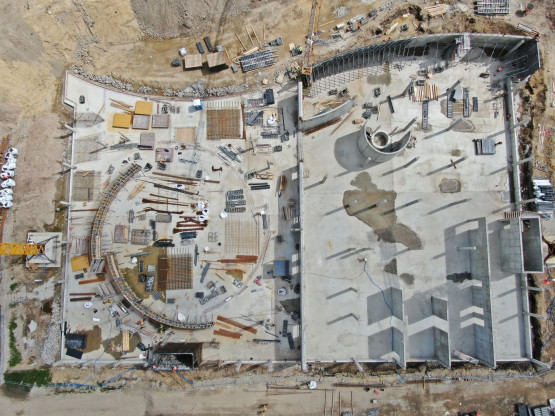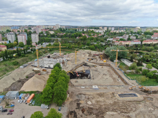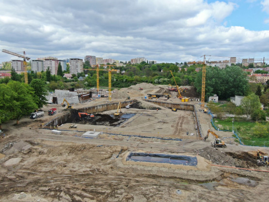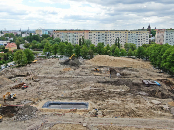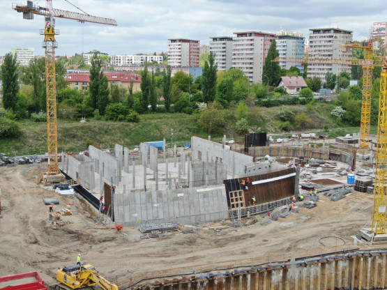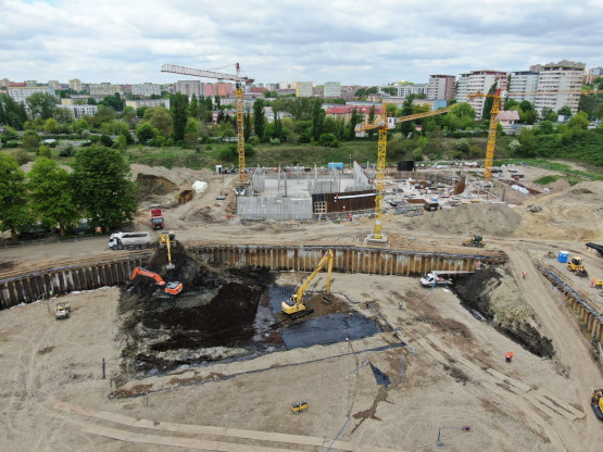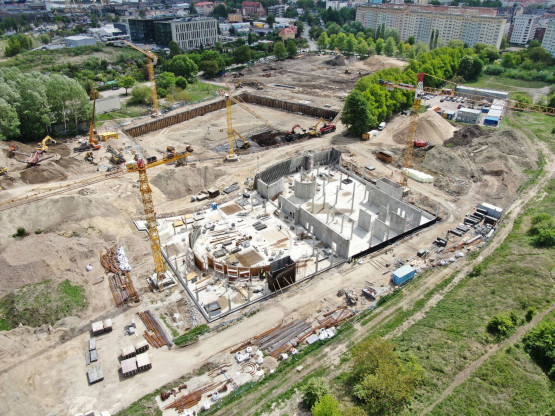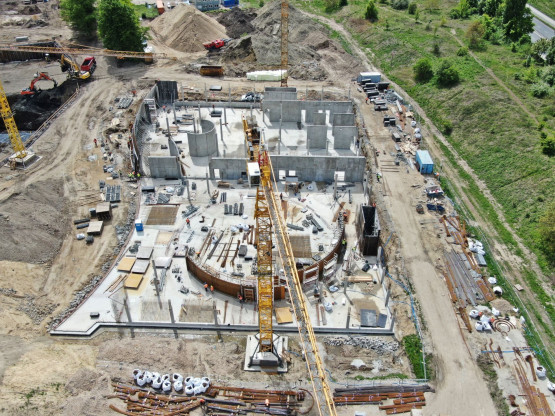 – Do góry pnie się budynek przyszłego Edukatorium. Trwają prace żelbetowe przy wykonywaniu słupów oraz ścian parteru. Kształt budynku jest już bardzo dobrze widoczny. Jednocześnie przy budynku realizowane są prace przy wykonywaniu przepustów pod instalacje elektryczne oraz prace przy wykonywaniu zwodów pionowych instalacji odgromowej. Pod budynkiem basenowym wykonany został kilkumetrowy wykop, który został otoczony ścianką szczelną. Wykonana została również platforma robocza pod palowanie – informuje Piotr Zieliński, rzecznik prasowy Fabryki Wody. – Realizowane są również prace związane z wykonywaniem kanalizacji deszczowej i sanitarnej oraz prace przy sieci wodociągowej.