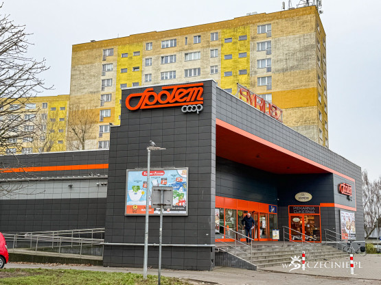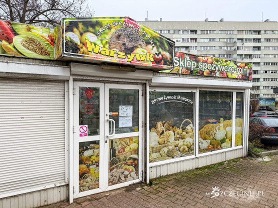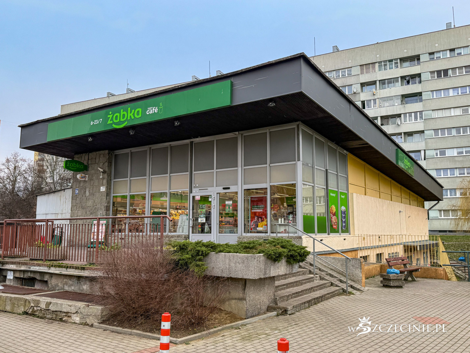 Nieopodal trafiamy na drugi, prawie taki sam pawilon, w którym mieści się sklep spożywczy. Nie robi już jednak takiego wrażenia – wszystko przez zlikwidowanie przeszkleń, które dodają lekkości bryle. Mieszkańcy osiedla przyjaźni robią jeszcze zakupy na osiedlowym ryneczku, gdzie znajdziemy piekarnię, warzywniak, sklep rybny, bistro z domowym jedzeniem.