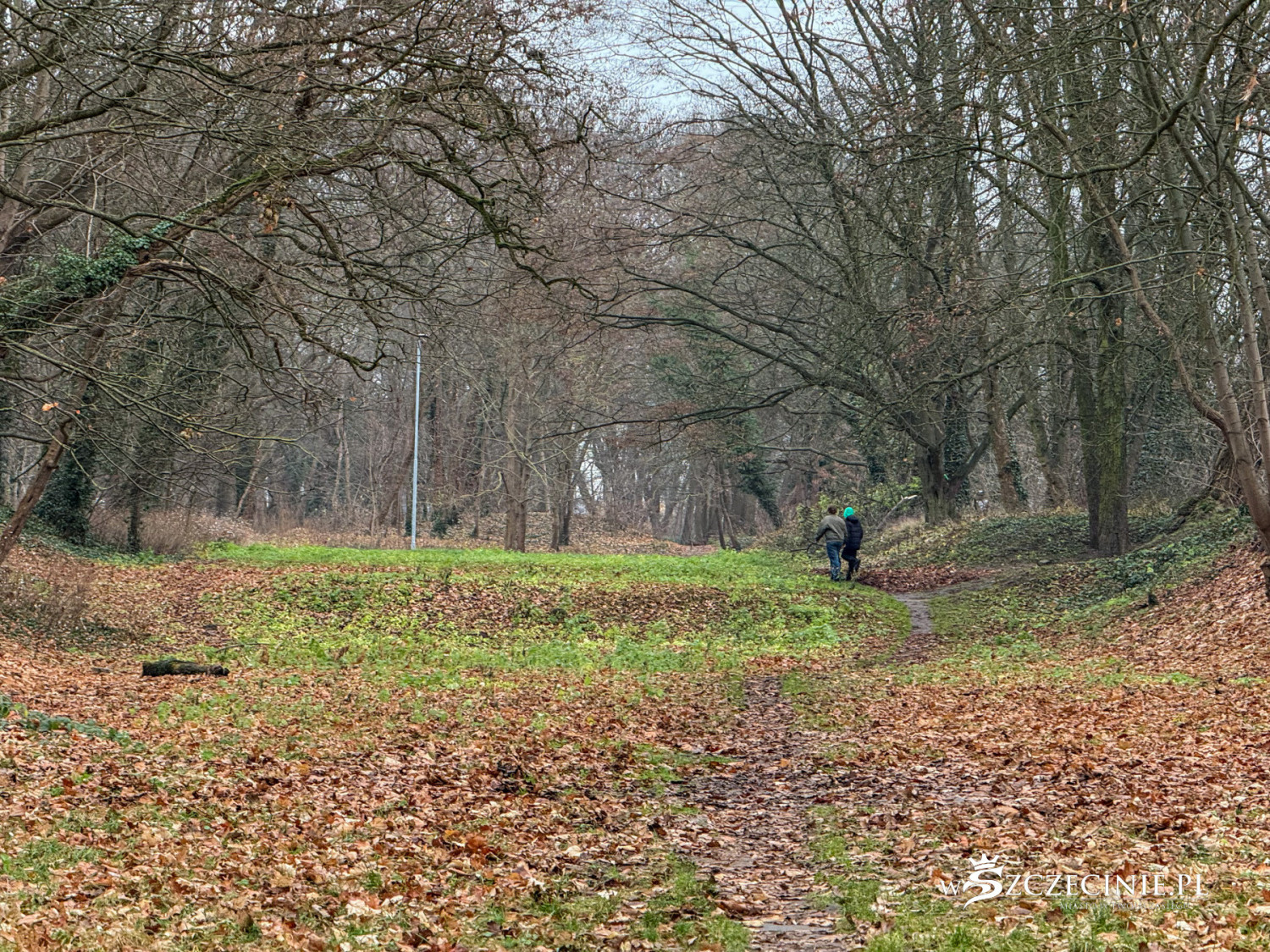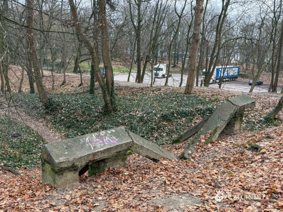 Niedużym laskiem podążamy w kierunku ulicy Twardowskiego. Mijamy betonowe pozostałości po dawnej strzelnicy – dziś wąwozy wykorzystują głównie BMX-owcy, którzy latem szlifują swój warsztat.