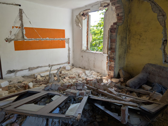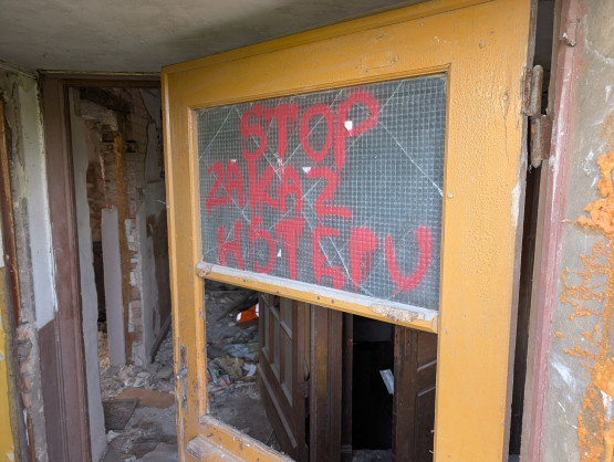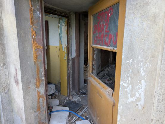 Gdy przyjechaliśmy na miejsce, okazało się, że wejścia do zrujnowanego obiektu w ogóle nie są zabezpieczone. Chyba, że liczyć krzywy napis farbą na szeroko otwartych drzwiach – „Stop. Zakaz wstępu”. W opuszczonych pomieszczeniach zalegają sterty śmieci. Zgłosiliśmy to miejskim urzędnikom.