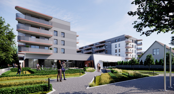 Dach parteru między budynkami wypełni zieleń z tarasami przynależnymi do wybranych mieszkań oraz wspólna strefa rekreacyjna. Na wizualizacjach wzrok przyciągają duże balkony. Zwłaszcza te w narożnikach z charakterystycznym zaokrągleniem.