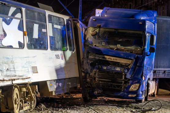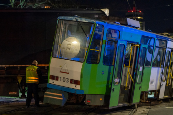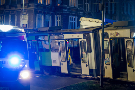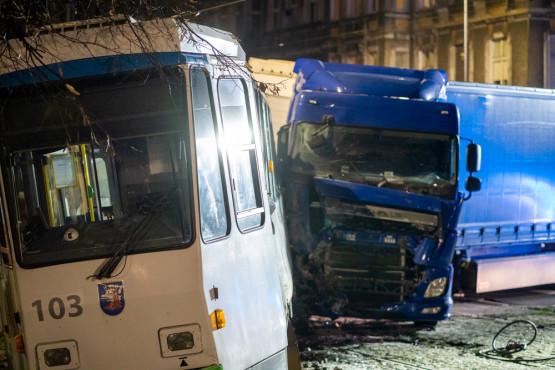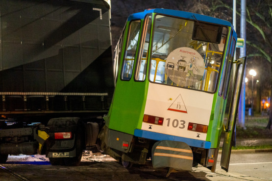Samochód ciężarowy wjechał w tramwaj na pl. Grunwaldzkim. Uderzenie było tak silne, że „jedynka” jadąca w kierunku pl. Rodła wypadła z torów.
