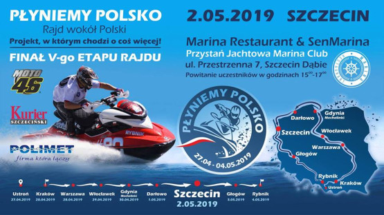 Również 2 maja w Szczecinie będzie miał miejsce finał piątego etapu rajdu skuterów wodnych „Płyniemy Polsko”. W wydarzeniu bierze udział ponad 30 zawodników, którzy w ciągu kilku dni mają do przepłynięcia kilkaset kilometrów. Skutery spodziewane są w Szczecinie około godz. 15:00. Z uczestnikami rajdu będzie można się spotkać na terenie Przystani Jachtowej Marina Club przy ul. Przestrzennej 7 w Dąbiu. Odwiedzający będą mogli wysłuchać koncertu rockowego oraz przepłynąć się skuterem wodnym lub pontonem. Szczegóły tutaj ![]()