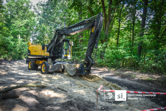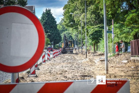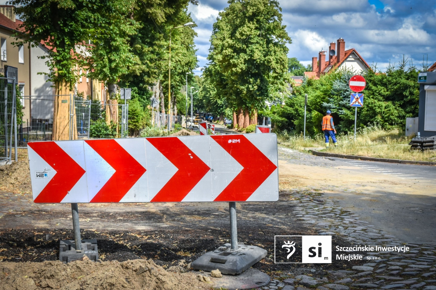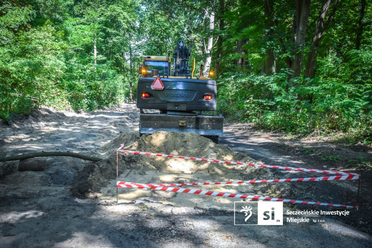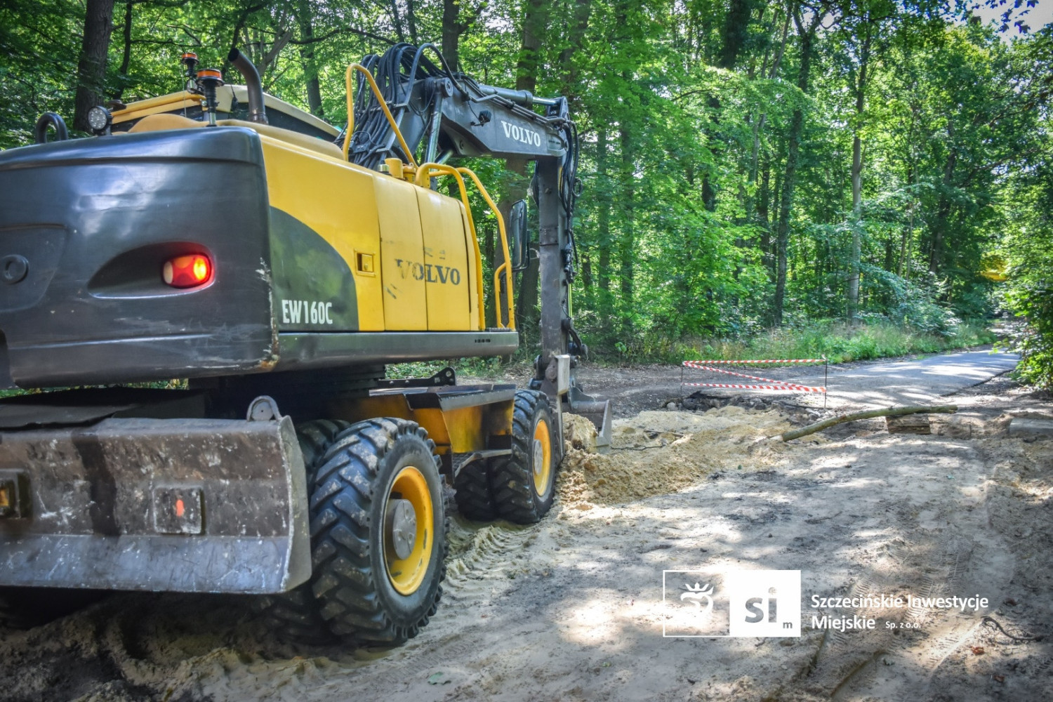 Nieco dalej, w leśnej części ulicy, nie ma już śladu po starej nawierzchni, która została rozebrana na całej szerokości. Wąski pas drogi uniemożliwia w tym miejscu prowadzenie robót przy zachowaniu przejazdu w kierunku Binowa. Mieszkańcy tej wsi muszą korzystać z objazdu, który prowadzi przez S3.