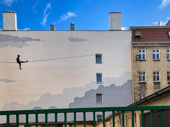 Ma prawie 2,5 metra wysokości i bez problemu siedzi w chmurach na cieniutkiej linie. Mowa o linoskoczku z muralu, który powstał na zlecenie Szczecińskiego Towarzystwa Budownictwa Społecznego. Praca powstała w 2018 roku według projektu Anny Dąbrowskiej oraz Eweliny Mikulskiej.