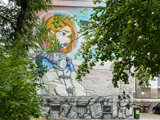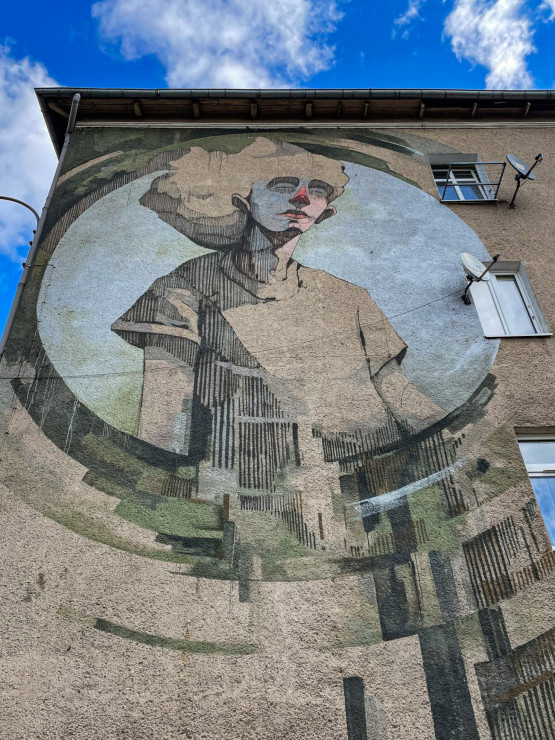 Androgeniczna postać na tle błękitu i zieleni. Praca autorstwa Michała „Sepe” Wręgi jest nienachalna, wręcz ażurowa. Artysta wykorzystał naturalny tynk kamienic, a inspiracją było zastane otoczenie – zielona okolica tuż przy rzece. Praca powstała w 2019 roku w ramach projektu „OdBlokowanie 2.0”, za który odpowiedzialny był Piotr „Lump” Pauk.
