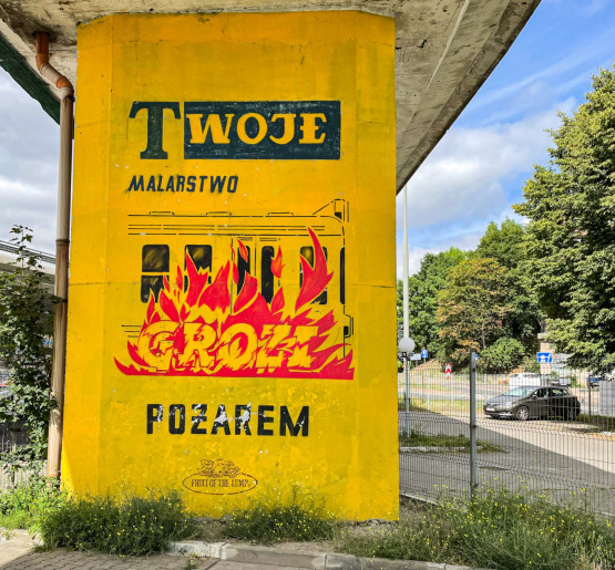 Pod Trasą Zamkową wyróżnia się intensywną żółcią. Mural „Twoje malarstwo grozi pożarem” to połączenie projektu starej tablicy BHP z artystyczną inwencją. Piotr „Lump” Pauk słowo „niedbalstwo” zastąpił „malarstwem”, a cztery okna zamieniły się w kolejkę EN57.