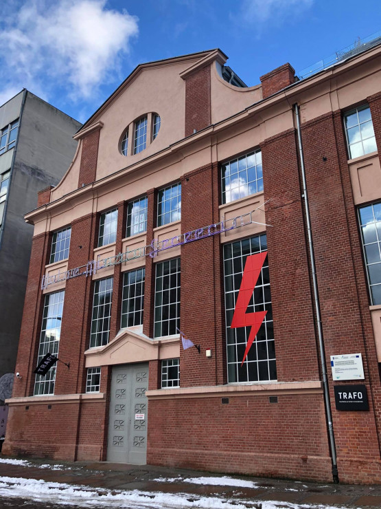 Czerwona błyskawica, która pojawiła się na fasadzie Trafostacji Sztuki, jest jednym z elementów najnowszej wystawy zatytułowanej „Co sobie kto na swój temat wymyśli”.