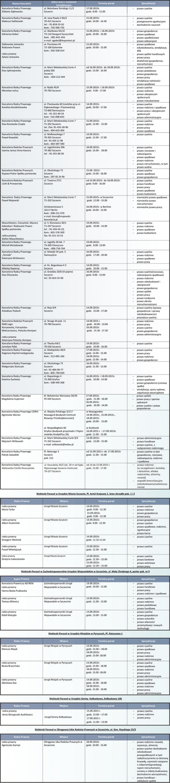 Szczegółowy wykaz miejsc, w których można uzyskać darmową poradę prawną wraz z terminami, godzinami i wskazaniem specjalizacji prawnych dostępny jest na stronie oirp.szczecin.pl