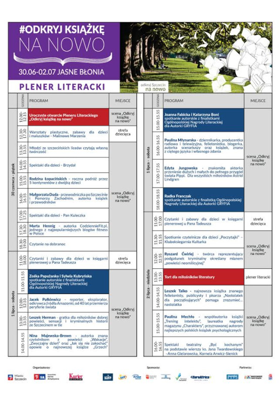 Szczeciński plener literacki to również niepowtarzalna okazja, by porozmawiać i zdobyć autografy ulubionych autorów. Już w piątek (30 czerwca) na plenerowej scenie o swojej podróży przez pięć kontynentów z dwójką dzieci opowie rodzina Łopacińskich (g. 15:00), z kolei Małgorzata Duda przybliży postać słynnej czarownicy Sydonii von Borcke (g. 16:00). Tego samego dnia będzie jeszcze okazja porozmawiać z Martą Hennig, autorką CodziennieFit.pl, jednego z najpopularniejszych blogów fitness w Polsce (g. 17:30). Pierwszy dzień pleneru zakończy się wspólnym czytaniem na dobranoc (g. 18:30).